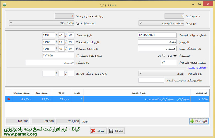 امکانات نرم افزار ثبت نسخ رادیولوژی کیانا: