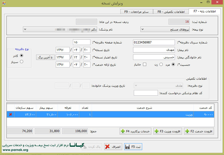 - نسخه ویژه برای پیمانکاران و مراکز رایانه ای جهت ثبت نسخ پزشکان متعدد و مراکز درمانی (جهت اطلاع از امکانات و شرایط خرید تماس بگیرید)
