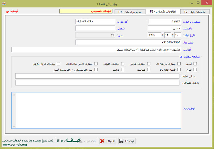 پنجره ثبت پرونده و اطلاعات تکمیلی بیمار
