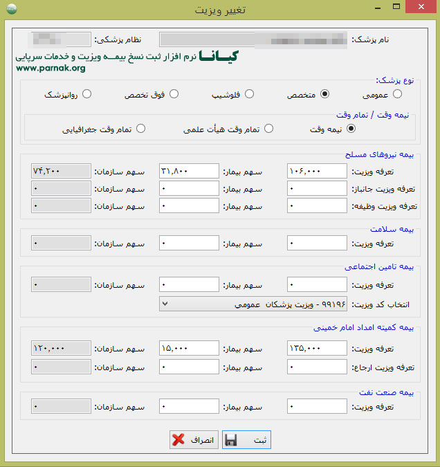 - مشخص کردن تعرفه ویزیت برای گروههای مختلف و نیز بصورت خاص برای هر پزشک